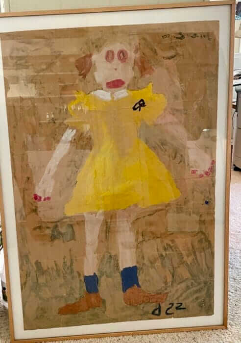 kindergarten. I forgot about it until Joe found in the back of a closet. The reason it’s so tall is because it’s “actual size.” My teacher, Miss Caldwell, had the whole class lay down on paper, and she traced around us, and then we got to paint ourselves! I was so excited to see it again. I had it hanging in my studio on the Vineyard at one time, but immediately it began to fade really fast . . . so I took it down and it’s been face-to-the-wall, hidden ever since.