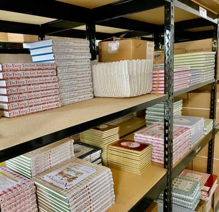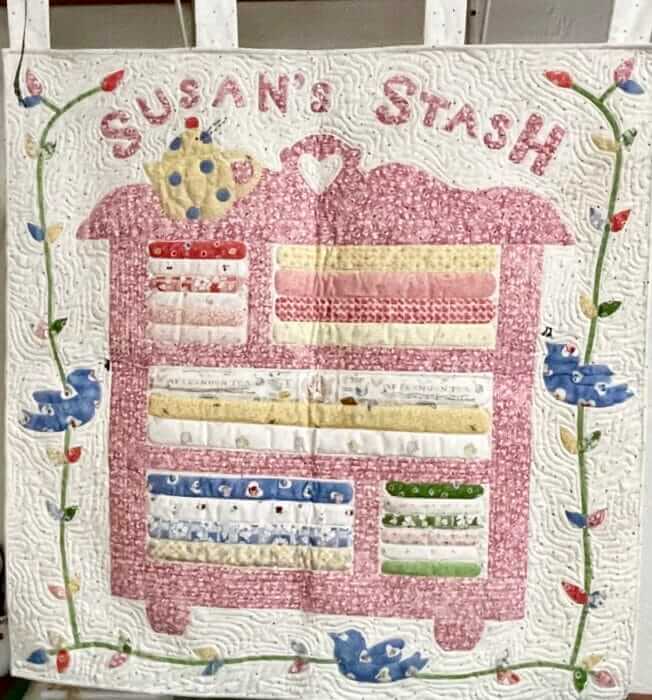 YEARS … like this appliqued quilt I designed for a new fabric line (new at the time) called Tea Party that Kellee hung over our cutting table. Note teapot on top shelf of appliquéd cabinet, and then I put the whole fabric collection on the shelves! And bordered it all with bluebirds of happiness because happiness, history, stories, and comfort is what quilting is all about! These fabrics are long gone, but we still have