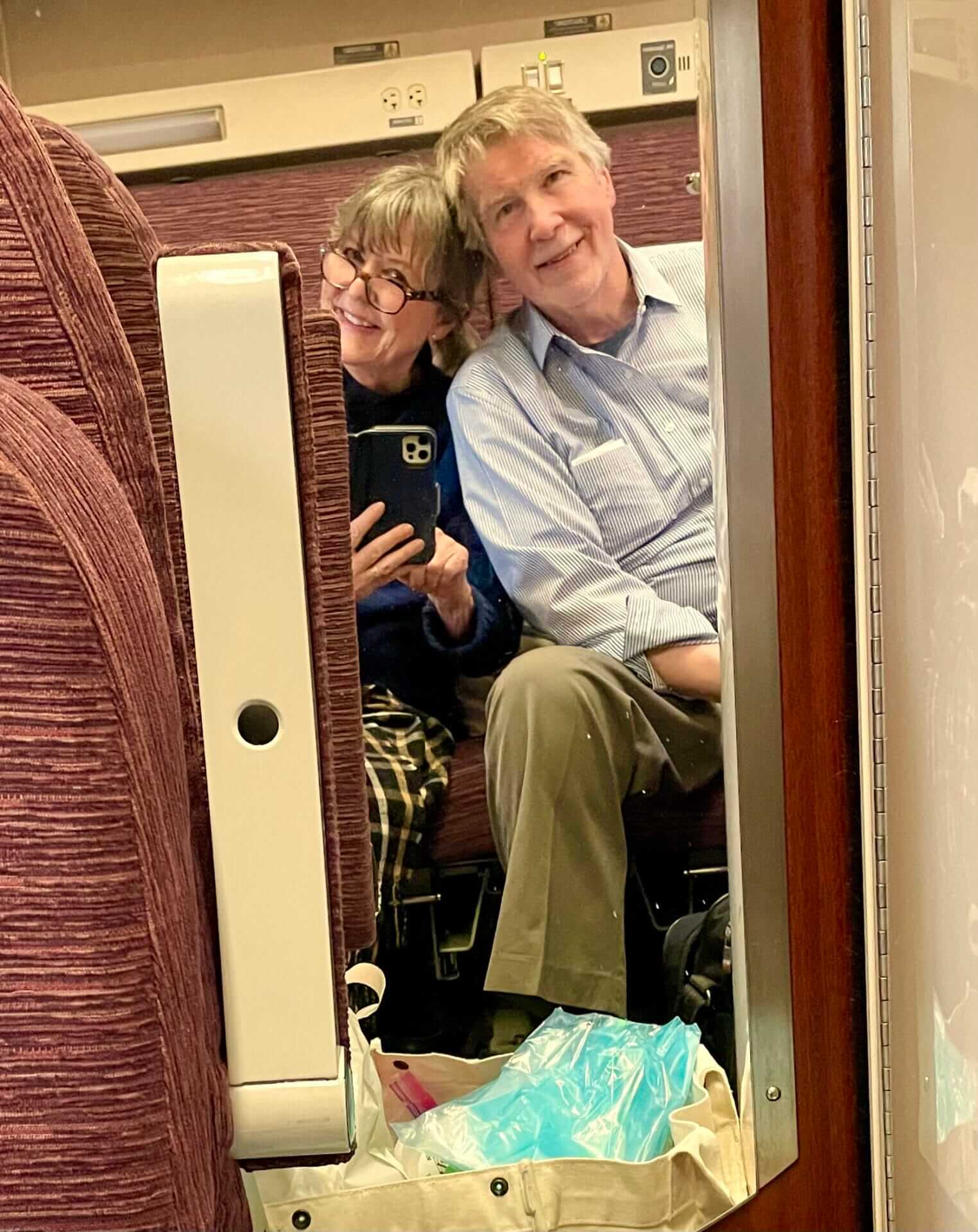 Well, here we are, in the mirror, happy as two clams, running away from home, tucking ourselves into our teeny-tiny room with a view, aboard Amtrak Lake Shore Limited to Chicago, just pulling out of South Station in Boston, then onward to Los Angeles!