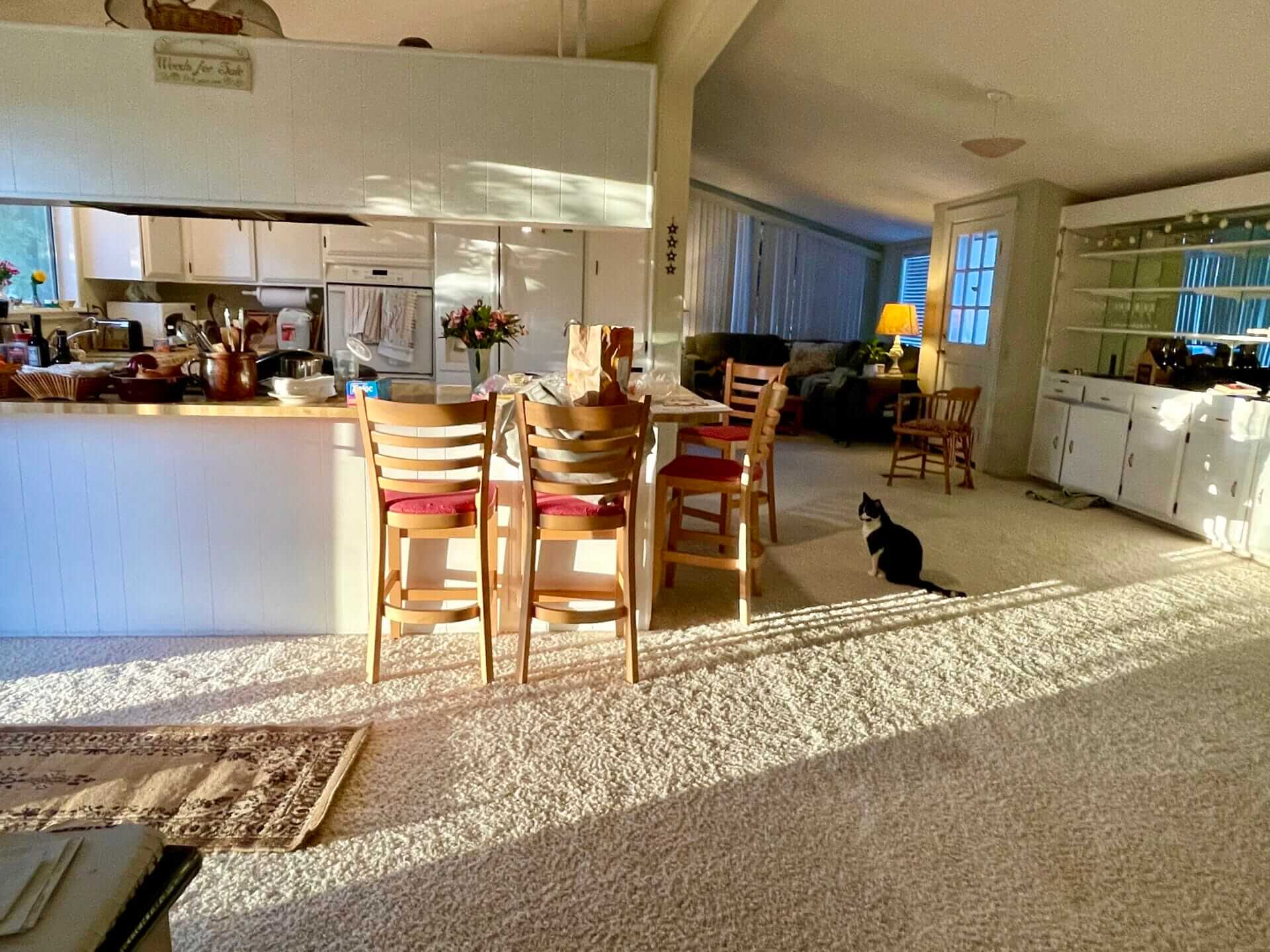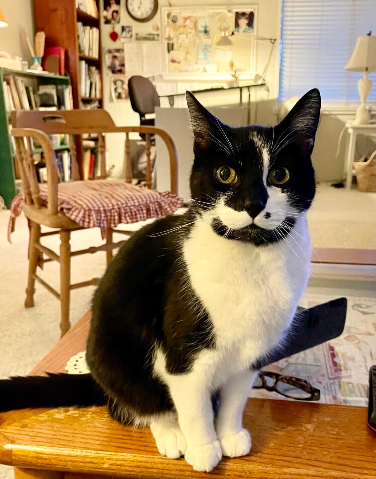 Yes! It’s Sammy ~ one of our studio kitties, so sweet, here to sleep with us, and provide deep-fur rubbing service!👏👏👏 Look at his freckle!!! He has a little Jack in him! And there’s my “studio,” in the back corner of the living room, with a view of the picket-fence garden…