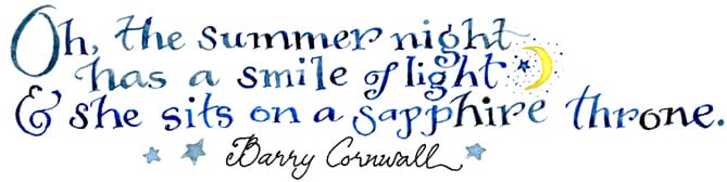 Such a nice party! We filled our plates with a delicious bean salad, a green salad, baguette sandwiches, watermelon, brownies, and lemon bars. She had set up lots of chairs in the garden where we sat, we ate on trays, and watched a silent movie on a screen they’d set up under the stars! Such a magical, creative evening! The music was wonderful. The fireflies came out! The movie was The Artist! Do you see the sapphire sky above the trees…?