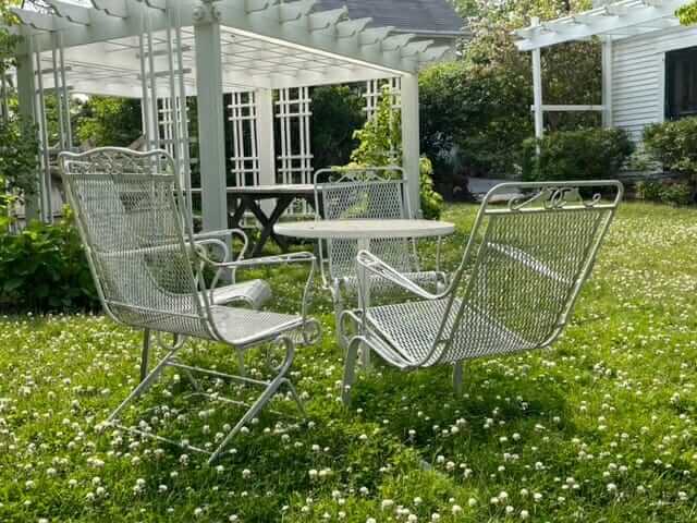 And look at this . . . it’s like a painting, the way the light falls on the Adirondack chairs! iPhones have such good cameras in them now! Slats on the lawn, slats slicing the picnic table under the arbor, affectionally known as “the Teahouse of the Vineyard Moon” so named by the Bowditch family who lived here before us and built the arbor.