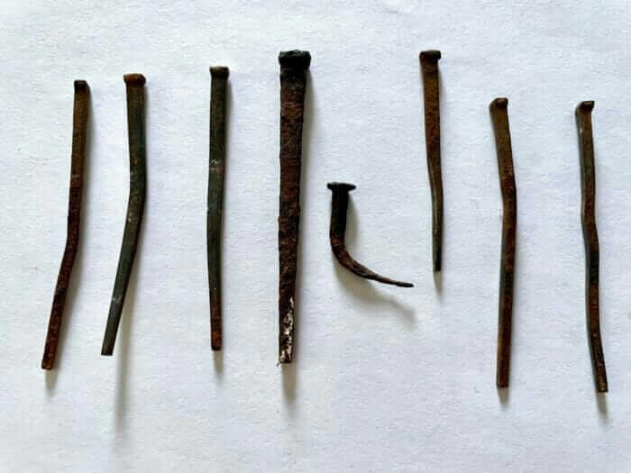 Joe saved me these nails he pulled from the walls. Aren’t they wonderful? They look handmade to me, house was built in 1849, but Joe says no, they are machine made. All but that bent one has a square “point” and a square top. I think I might have to put them in a shadow box and save them for future owners. Sometimes nails are what dreams are made of.🏡💫💫💫
