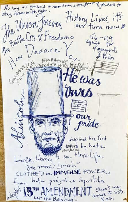 I’m reminded on how much you notice about someone when you are painting them. We became best friends. I love his compassion, the empathy I found in his eyes, the honorableness in everything about him, and his hellbent determination despite EVERYTHING. Plus, the purple tie was the bomb, and he had some good hair! A few years ago Joe and I went to the Lincoln Presidential Library in Springfield, Illinois. Let me say, their website does NOT do it justice. It is SO wonderful. You learn so much! You would love it if you are ever in the neighborhood, but it’s worth a trip if for no other reason but the War Gallery Exhibit, which I cried all the way through. Came out of it and there was a museum guard there, dressed in uniform, I said to her, “How can you stand it, how are you not crying all the time?” She nodded and said, “I know.😥” Inspiration is everywhere!