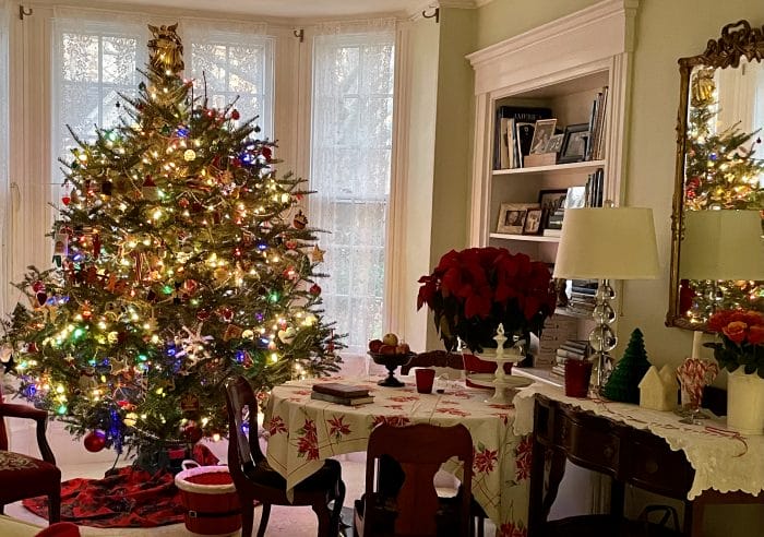 We’re leaving the trees up and lit, both inside and out, until Twelfth Night. By that time, I’m sure this one will crumble into dust! I tiptoe by it and hear the tinkling sound of falling needles! But it’s still pretty! Let the celebration continue!