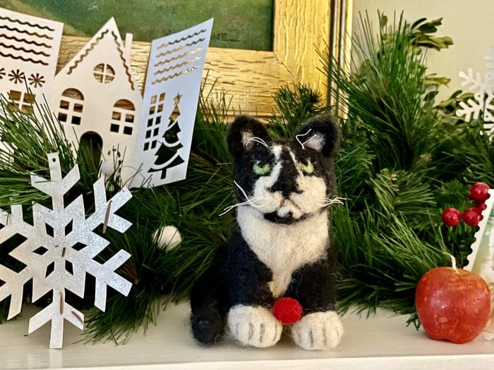 My treasured felted-wool Jack doll took center stage on the mantle this year. I have to hide him from the real Jack or he will EAT him! He came complete with felted red ball.❤️