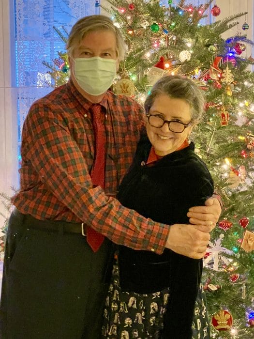 Nothing left to do but go take pictures in front of the tree. Elaine and I told Joe he could take his mask off because whatever he had we had ~ and we might as well enjoy what was left of this abbreviated mini-half-life. But you see in the photo, he didn’t want to breathe on me, and that was the best smile he could muster. And then it was over. Elaine went home to her dog Ripper. We stared at the fire and drank a glass of egg nog, I sang Peggy Lee, “Is that all there is . . .” Pitiful. Wracking my brain doing the Pollyanna thing, trying to find the good in this. Of course, it’s always there. Nobody would be sick.