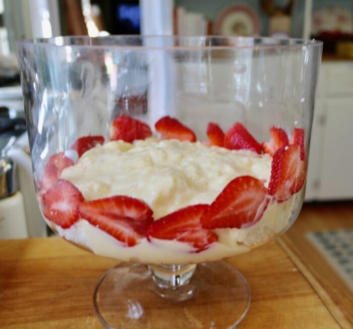 Simplest, prettiest, easiest dessert makes a WOW at a party that’s already a WOW from the love in the room.💞💖💞 Here’s how to make one of these beauties: layer, from the bottom, store-bought angel food cake cut into bite-sized pieces (or any cake, even brownies or cookies!), then spoon pudding or custard over the cake . . . I made old-fashioned vanilla pudding with Agnes’s (from Holly Oak!) 1946 Joy of Cooking (could be chocolate pudding, could be lemon, could be butterscotch, could include coconut), then I placed a line of cut strawberry halves around the edge with more in the middle (instead of strawberries it could be bananas or mixed fruit), and added a layer of homemade whipped heavy cream ~ then I did it all over again, ending in whipped cream . . . so it looked like this . . .