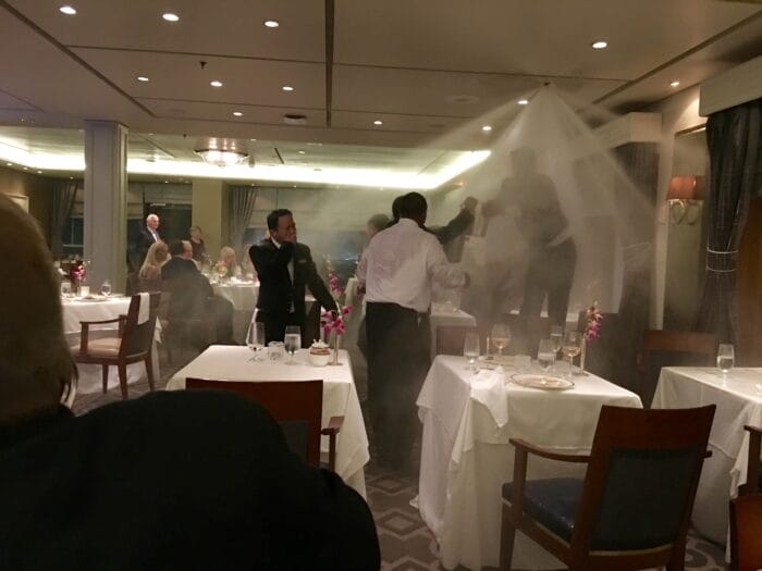 As the people who were sitting at the six tables around this nightmare can attest! The waiters light food on fire in the dining rooms, flaming Steak Diane, Bananas Foster, Crepe Suzette, etc ~ very festive . . . but this time a flame went too high and licked the fire sprinklers and SURPRISE! Very quick movement of people OUT of their chairs, flinging themselves across the room! Everyone else grabbing their cameras!Poor waiters were rushing out with buckets, trying to stop it as fast as they could . . . no one was upset, most people were laughing and feeling bad for them, and trying to help by staying out of the way! But yes, things happen. And that’s where the stories are . . . that’s what you’ll be telling about and remembering for years to come! Travel isn’t always easy ~ nothing is normal, you are not going to be able to find anything the entire time, but when you get home, you forget all that and just wallow in the fact you DID it, you enlarged your heart and soul, you found beauty, you made yourself smarter, you became an inspiration, you spread sunshine and made the English people love our country because of who you are, you saw the world!