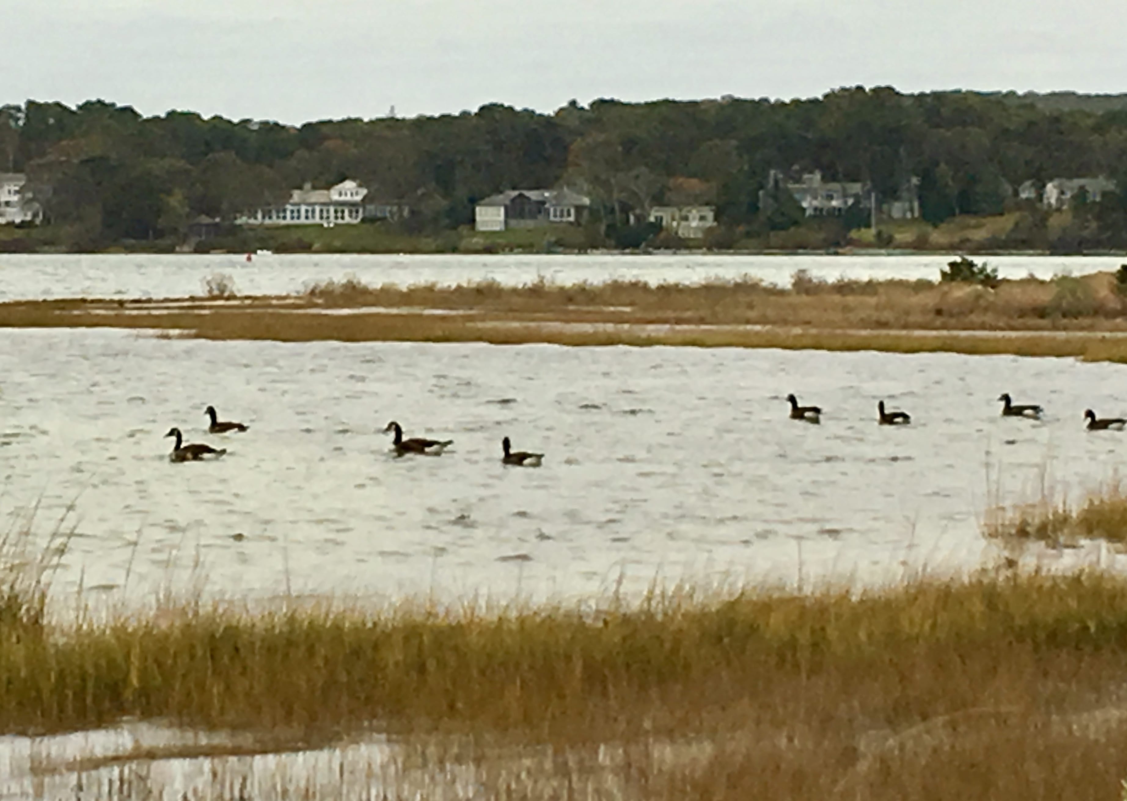 Our walk never gets boring even though we’ve been going this same route almost every day, in all seasons, since we moved into our house in 1989… down a sun-splotched, puddled and rutted dirt road, through the woods of pine and oak, now festooned with bittersweet, past old fishing shacks, to the sea . . . and back. A perfect almost-three miles. Best part of our day.