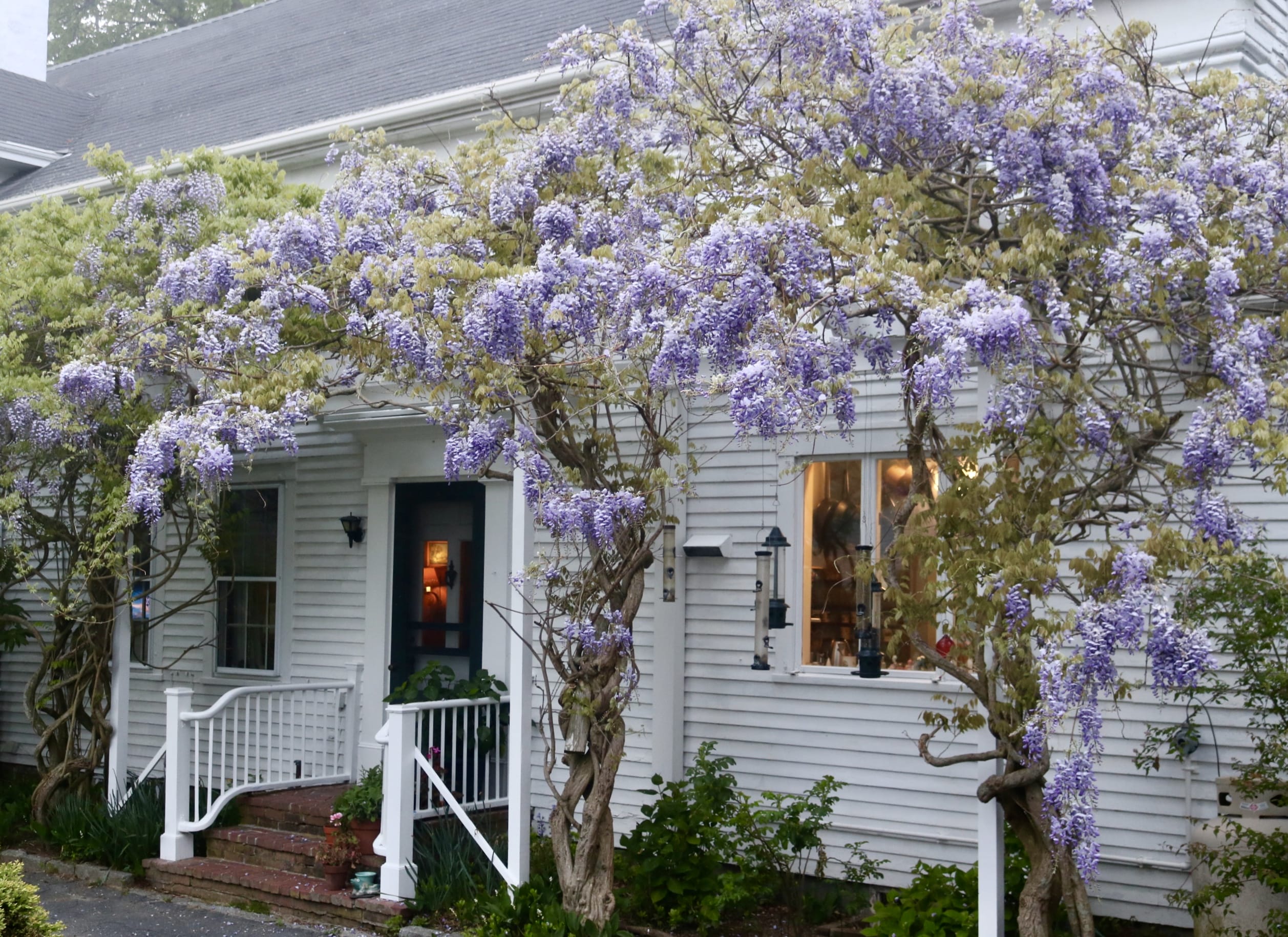 We took off our storm windows yesterday. The doors are open now, the sun is shining, it’s about 68º, the wisteria’s in bloom, so are the lilacs, and the sea breeze is blowing fragrance through all our rooms. Sleeping is heaven! We’ve waited months for this! Do you believe that purple? Mrs. Bowditch, the woman who lived here before us, planted that maybe 50 years ago and I thank her every spring.