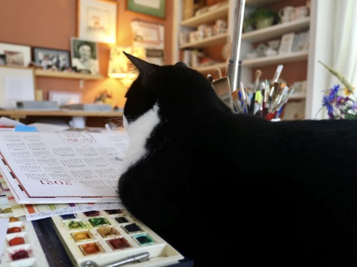 plunged into darkness. Wind blowing, clunking shutters, and the snow plow going by were the only noises. Again, like always, I felt like there was no now, it could be any year, I was in the time machine. Do you know how many years I’ve been doing calendars? It’s crazy. I did my first in 1993 … I skipped a few years, but I think now there are 25 (last time I took a picture of them there were only 20, and I have to say, that felt like yesterday!), and that just counts the wall calendars! Here’s a wee preview of 2021: