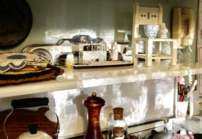 This is a photo I found a long time ago, but have never had a reason to put up until now . . . see what being calm brings us? A doll house! Look at that little bed! And the rug!