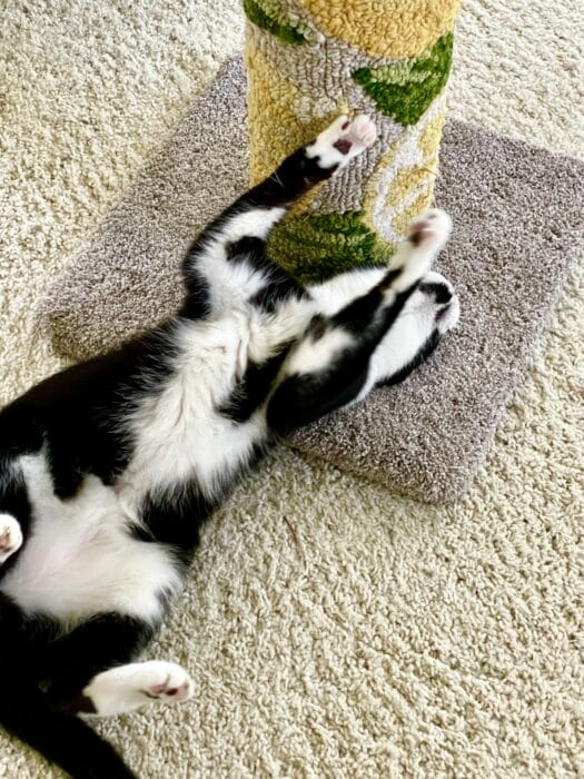 But as you can see from these photos, he’s better, getting used to it here, and coming back to his old self. Joe made him a new scratching post.