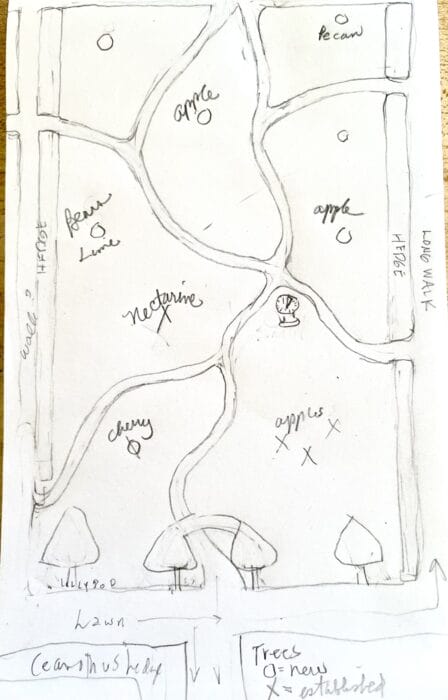 This is the plan for the path in our new wildflower orchard … the wildflowers will go everywhere, but as they grow they will be mowed in a pattern much like this, only one lawn-mower width, through the flowers.🌸 Established fruit trees are where there is an X🌳, Zeros are where the new trees🌿 will go, and the whole thing will have a hedge around it, and paths will go through the hedges, as “doors,” which will lead to other gardens, when we get done making what we have. Decorating will never end!👏 Our old sundial will go right there, at the 4-way stop. Might let two of the lolly-pop trees grow together to make an arch at the entrance. If we don’t feel around 5 years old walking that path this summer, then I have not done my job correctly.🌷🌷🌷