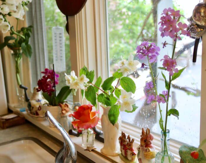 One of my favorite cottage-garden flowers ~ my birth flower, too. They grow like wildfire in the garden at the California Studio, but NOT here. I decided to try again. So far I have one-and-a-half flowers, and if it doesn’t get too hot or too humid too soon, I might get another one! They have the most delicate fragrance, even more precious for being so rare. See? Just one little flower in a jar is all you need for happy kitchen puttering.🌺