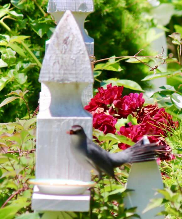 It’s for this guy ~ he’s a catbird. Lowely talks to him every morning in his own language, she calls, “Meow” and she says he comes to her, because she has treats. So now we’re both soaking handfuls of raisins in warm water (for about a half hour to soften and plump them), and putting dishes of