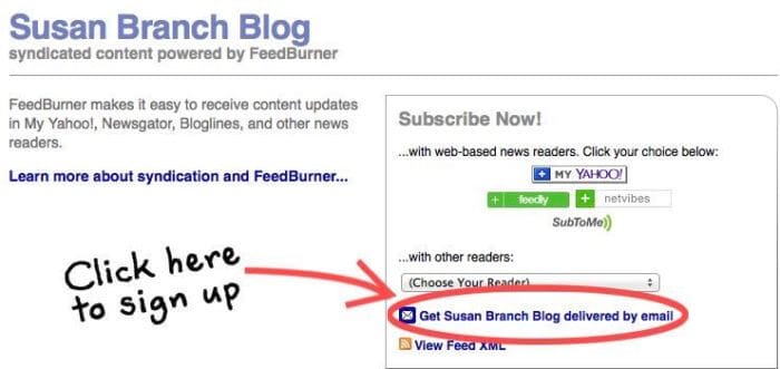 A screen that looks like this will come up. Not very Susan Branchy, but it does deliver! Just click the little envelope in the red circle . . . sign up, and from now on, when there is a new blog, it will simply show up in your email!💌 If you want , you can go from