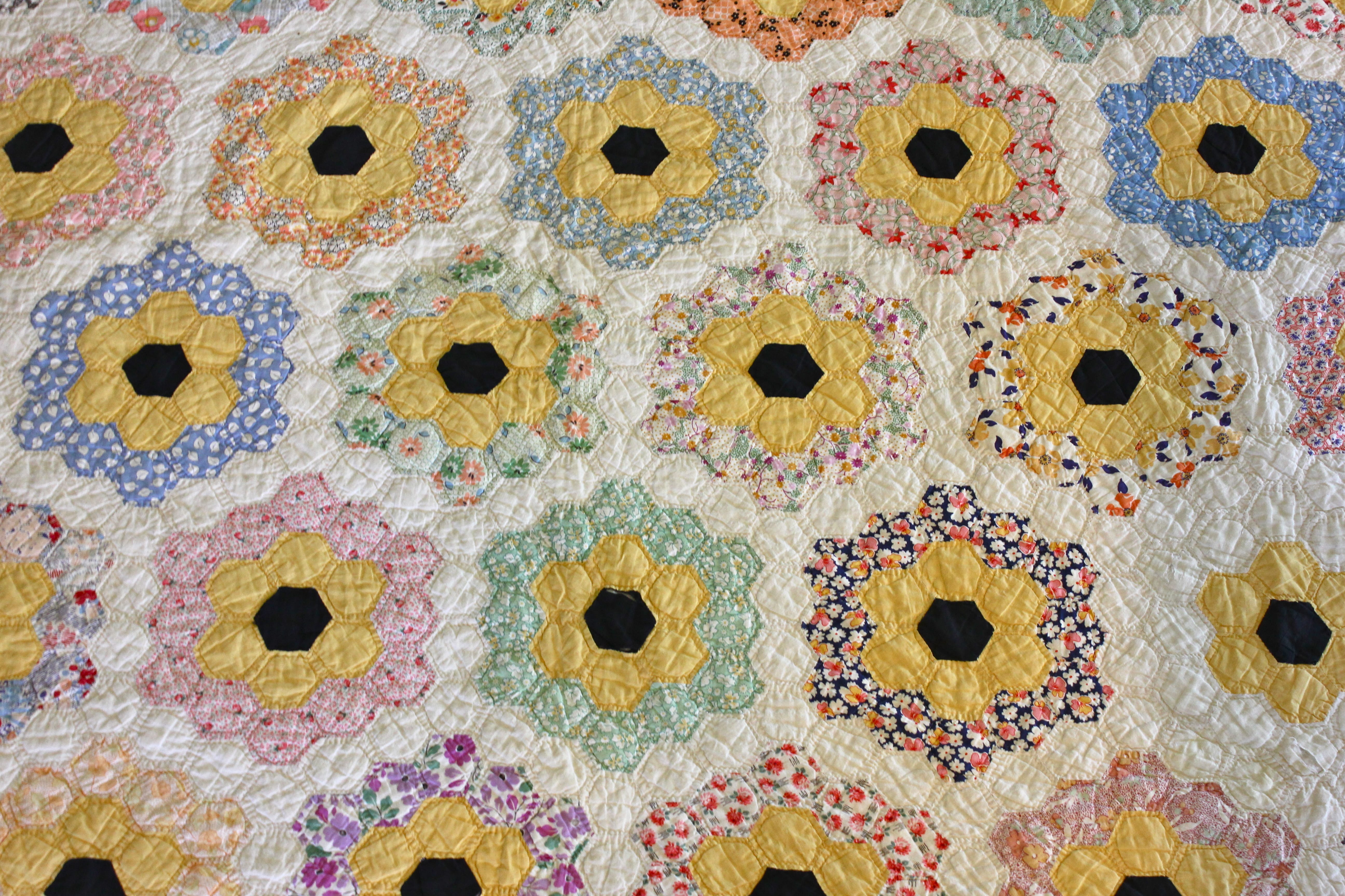 Many of the old patterns have charming names like Wedding Ring, Jacob’s Ladder, or Log Cabin. This one is Grandmother’s Flower Garden.