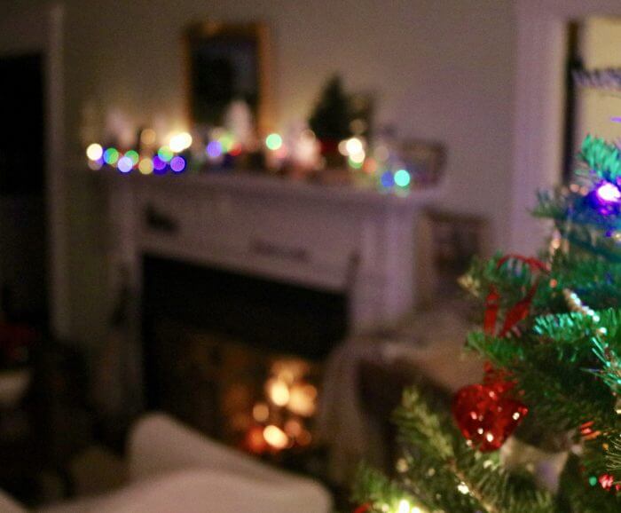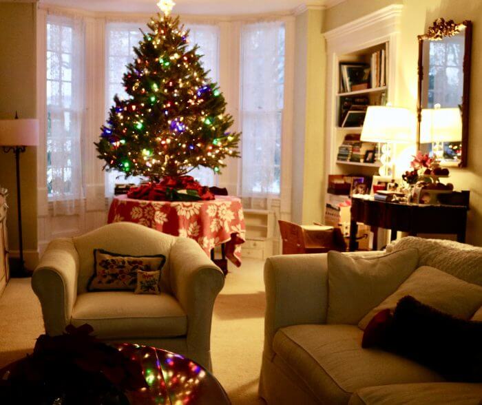 Our halls are decked . . . twinkle lights are bouncing around, from the tree, around our doors, reflected in the windows and mirrors, and even in the reflection on the table!
