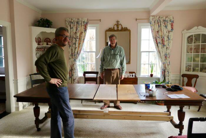 Before they came, Joe made a new leaf for the table so we could fit all our Christmas dinner guests at one table. But when he put it in, the table was so long, it sagged in the middle. So the two “engineers” as they called themselves, spent Christmas Eve in table fortification . . . you can see them in process here. It was just the beginning. They glued all the wobbly chairs too! Mas MUSICA?