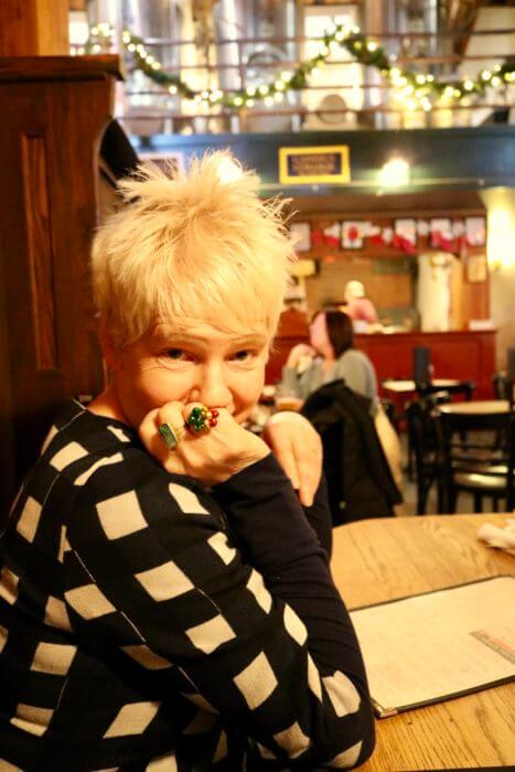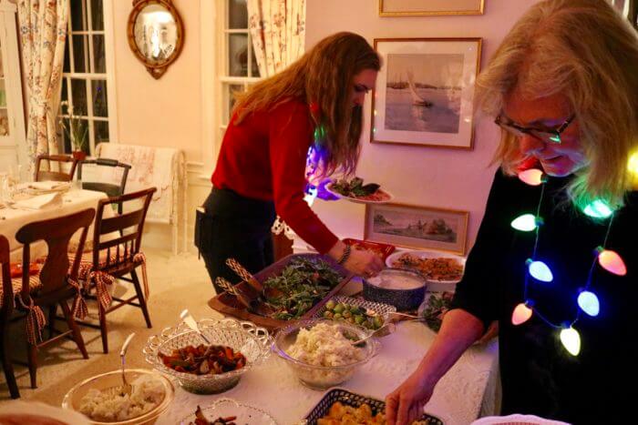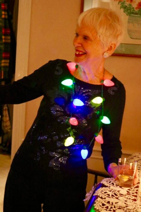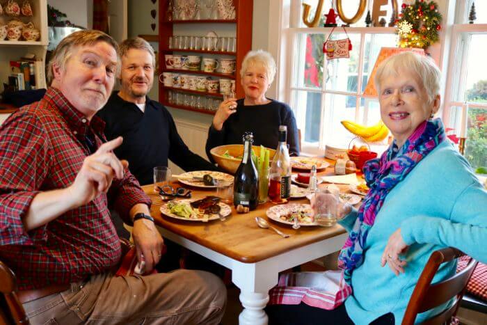 We put my camera on a tripod to take our official Christmas photo. Beloved faces, names of friends you’ve heard me mention, Martha and Gerry, the Schwiers, Lowely and John, their children, nieces, and brothers, our luv-lee English People, and at the far end, me and Joe …