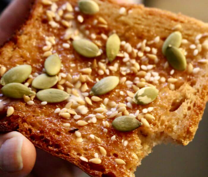 Making seedy toast, because I like crunch. I bought all different seeds in small amounts in the bulk section of our market . . . and mixed them together in a jar . . . I chose seeds from THIS LIST … read about their health benefits!